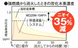 | ■メタルバーナ採用 消火時のニオイを抑え、耐久性も向上しました。 これまでによりさらに快適にお使い頂けます。 ![]() ■新・2段燃焼構造 保炎板と2段で空気を取り入れる燃焼構造の採用で、効率よく安定した燃焼を実現します。 ![]() ■スピード着火 運転スイッチを押してから、わずか80秒で着火します。 ■ニオイの少なさ 消火時に秒速消臭システムがはたらき、火力を落としてバーナを高温にし、ニオイのもととなる未燃ガスを燃やします。 ![]() ■音を包みこむボックス構造 バーナ部をボックスで包み込むことで、最大燃焼時も45dBに低騒音化しました。 さらに、放電音のしないセラミック点火ヒーターを採用しています。 (MD25M-104FH/MD25M-104FS、MD25M-103FH/MD25M-103FSの場合) ■熱くならない天板 ![]() ■見やすい表示 デジタル表示で運転状態がひと目でわかります。 暗い場所でも見やすいLEDを採用しました。 ![]() ■タイマー機能 10分単位でセットできるタイマーで、ご希望の時間に自動で運転をスタートできます。 ※このほかに、不完全燃焼防止装置、対震自動消火装置、停電安全装置、過熱防止装置(MD25M-194NH除く)、燃焼制御装置、点火安全装置などの安全装置が付いています。 ■6時間延長機能 消し忘れ消火装置で運転開始約6時間後に自動消火。延長ボタンを押せば、さらに運転継続できます。 ■換気ランプ タンク内に水がたまると、点滅してお知らせします。 ■自動温度調節 自動にしておけば、ルームサーモが働いて自動的に温度を調節、お好みの室内温度にします。 火力をお好みで選び運転する手動運転との切り替えもワンタッチです。 ■タイプ